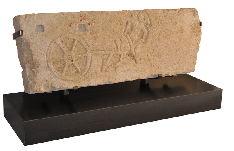 Ce relief, exceptionnel en raison de la rareté de son sujet, montre un paysan tenant des deux mains les mancherons d’une charrue. Ce personnage paraît dépourvu de jambes. Bien que son corps soit de face, son visage est, lui, de profil. Un capuchon lui couvre partiellement la tête.
