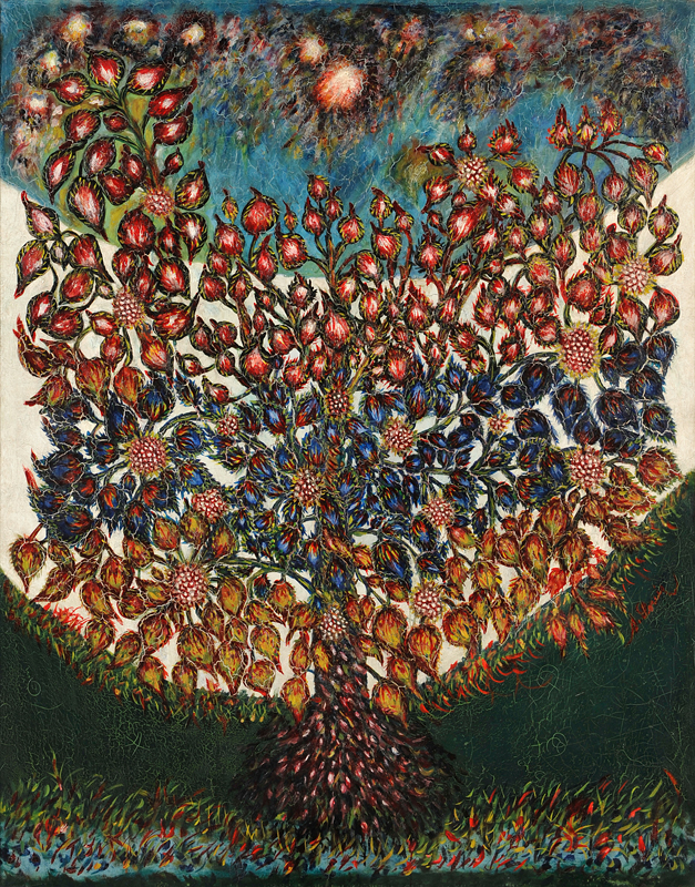 Sur un fond vert, beige et bleu se déploie un arbre de forme ronde pourvu de racines. Ses feuilles, aux dominantes rouges et bleues, se redressent graduellement et couvrent presque toute la surface de la toile. Elles sont ornées de longues touches colorées qui semblent être inspirées de plumes. De petits points blancs rehaussent et animent cette composition. Séraphine ne s’applique pas à représenter une essence d’arbre particulière, elle imagine une flore foisonnante et colorée.