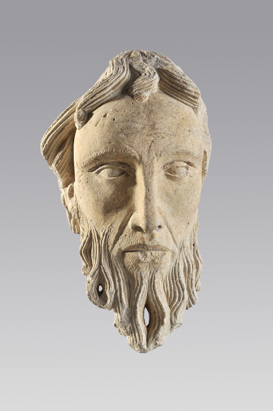 Cet élégant visage allongé constitue l’une des œuvres majeures du musée. Le modèle arbore une barbe et de longs cheveux à mèches striées. Il ne portait sans doute pas de couronne. Ses pommettes sont saillantes et ses rides nettement marquées. Aucune trace de polychromie n’est plus apparente sur ce visage qui a pu être peint à l’origine. Des traces de ciseaux à bout rond pour creuser les sillons et tout un travail d’égalisation des surfaces sont visibles au revers de sa barbe.